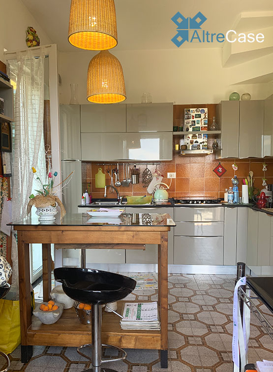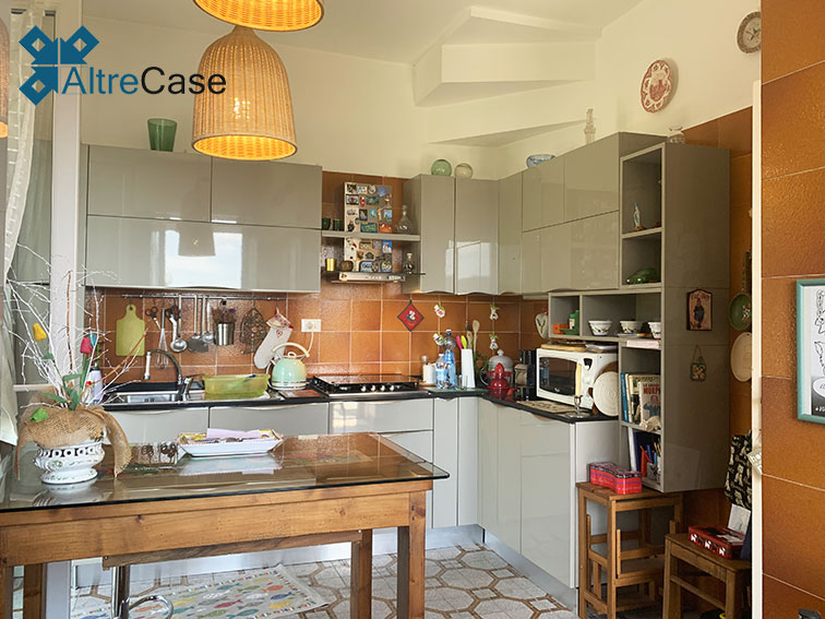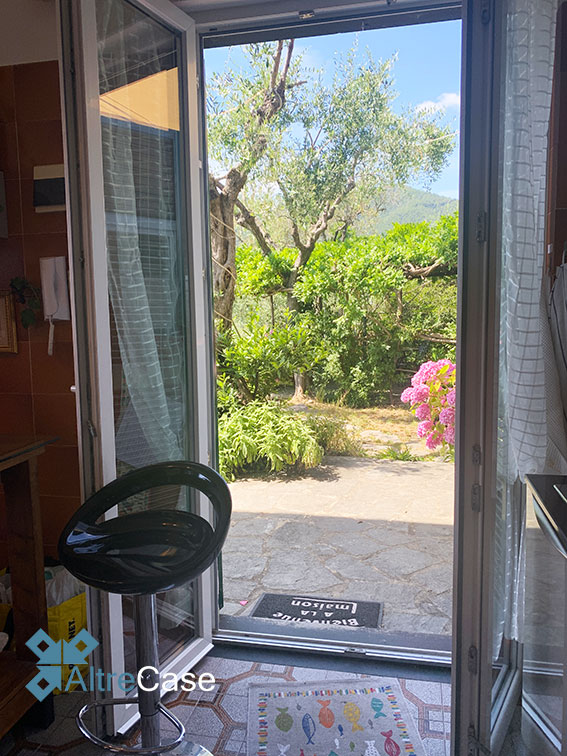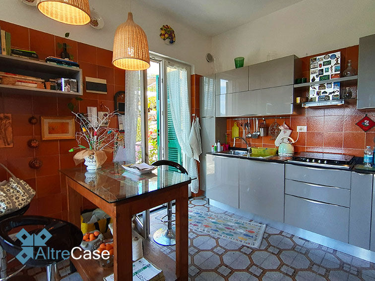 La terrazza attrezzata permette l’accesso nell’appartamento composto da ingresso, ampio e luminoso living con vista mare, cucina abitabile con portafinestra sul giardino.